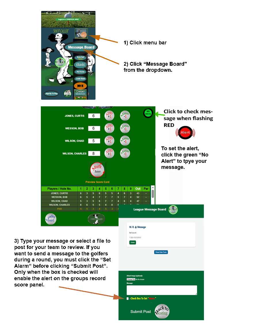 GSKV3 includes a built-in alarm messaging system that alerts players to important updates at the start of play and throughout the round. Any player logged into the GSKV3 app can set an alert. Use this feature to notify others of unexpected course conditions, weather changes, wildlife sightings, or other important information.