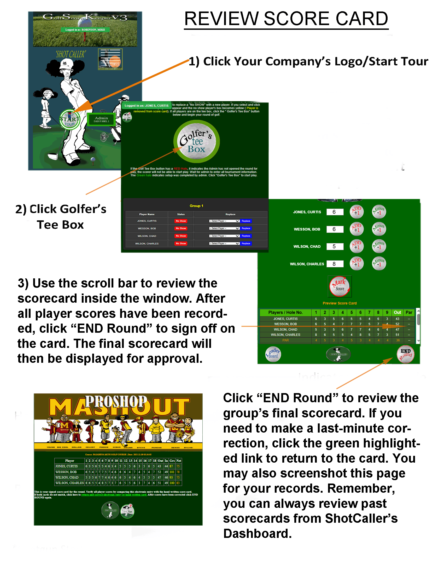 Your company business logo can be displayed as your “START TOUR” button to begin scorekeeping for your groups — Only player assigned to a group may record scores for that group.