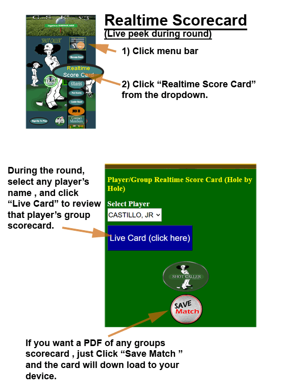 During and After a round, scores can be entered manually for verification by the group's scorer or admin's. Go to Record Scores.